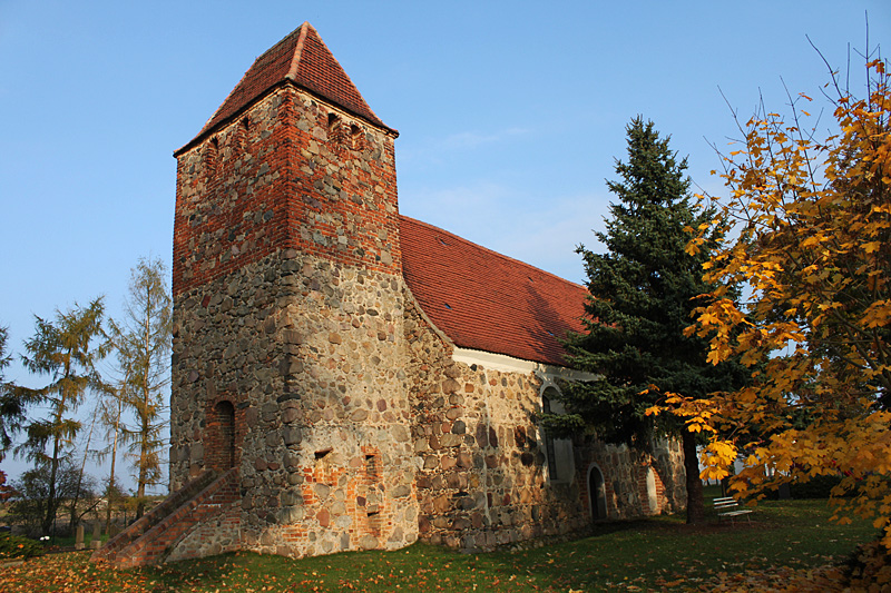 Das mittelalterliche, evangelische Kirche wurde aus Feldsteinen errichtet und besitzt einen Turm auf der Westseite. Im Inneren findet sich eine barocke Ausstattung aus der Zeit um 1700, darunter die 1713 entstandene Patronatsloge und ein etwa 1724 geschaffener Altaraufsatz.